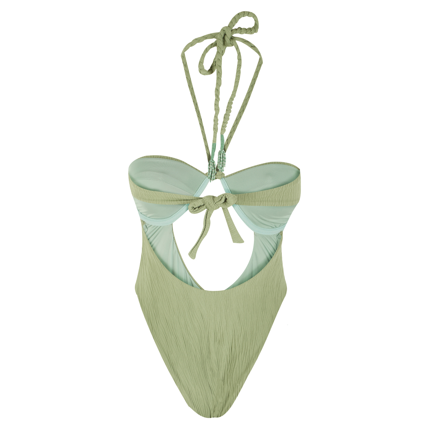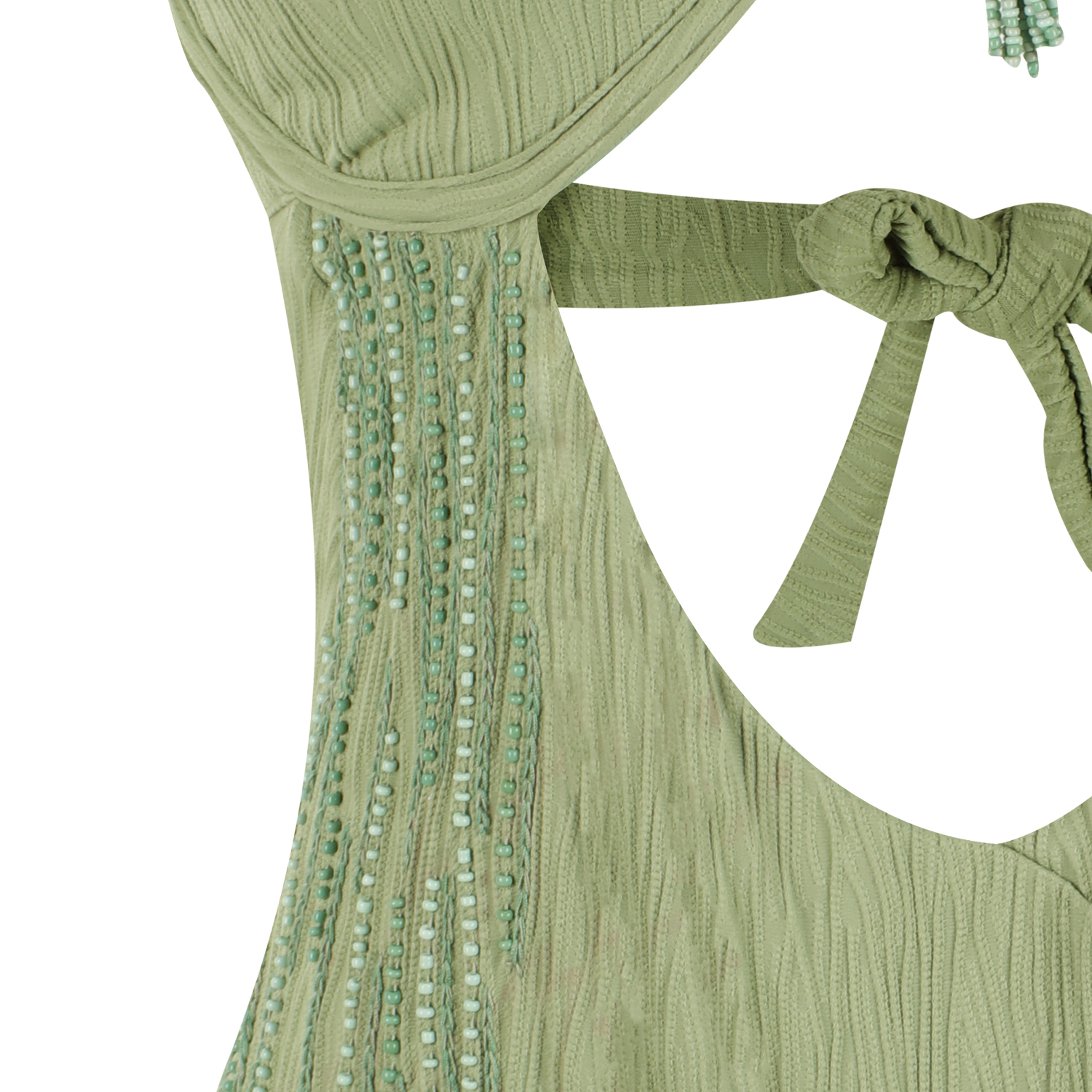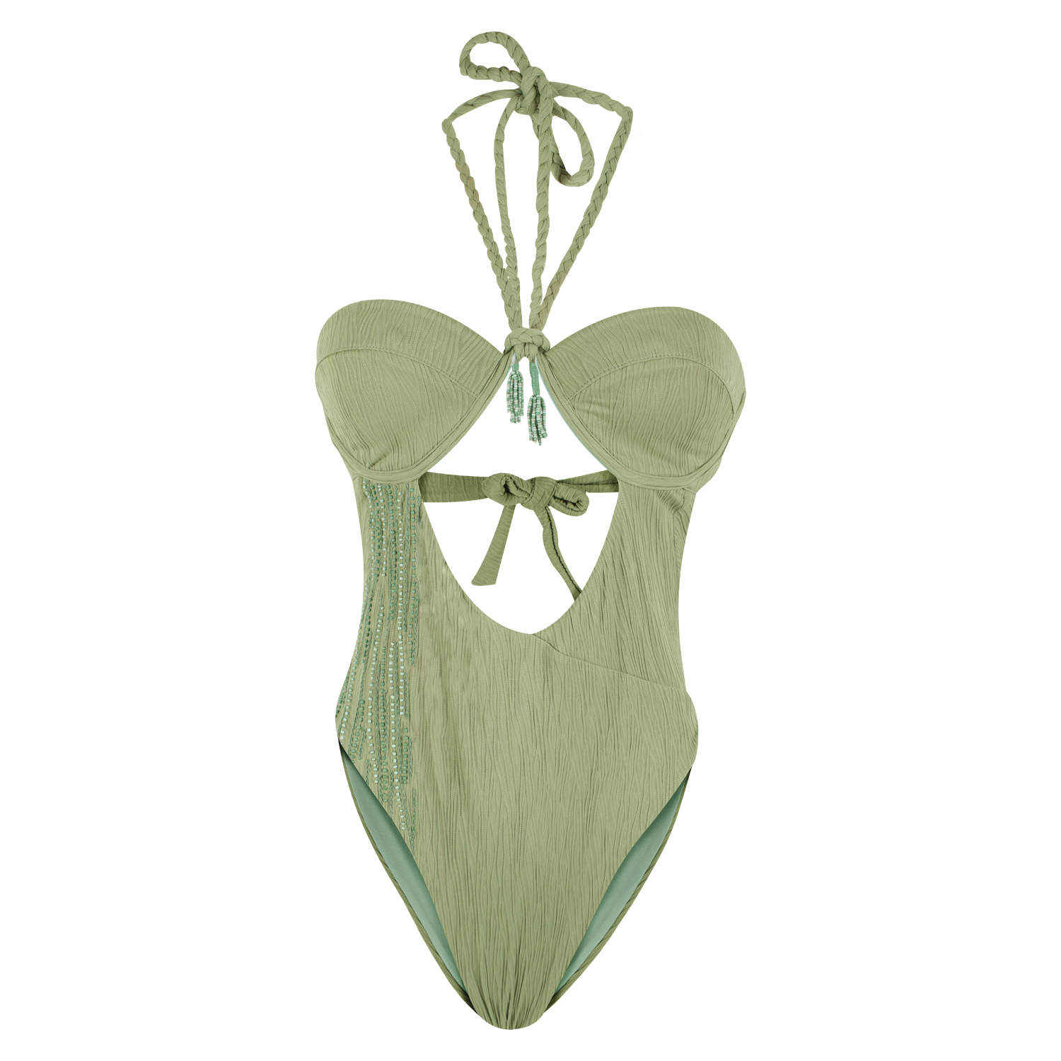 Maillot de bain une pièce avec bonnets ronds, bretelles tressées et embouts brodés de pierres.